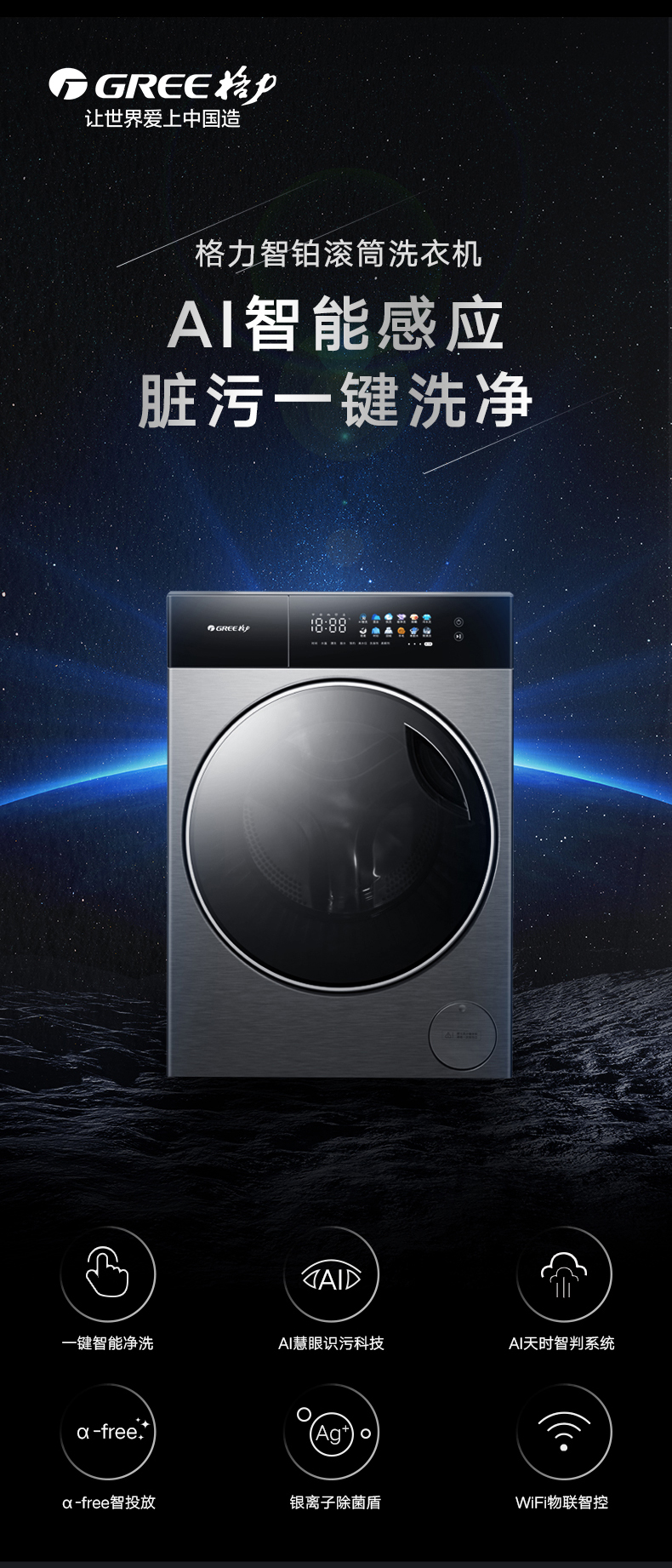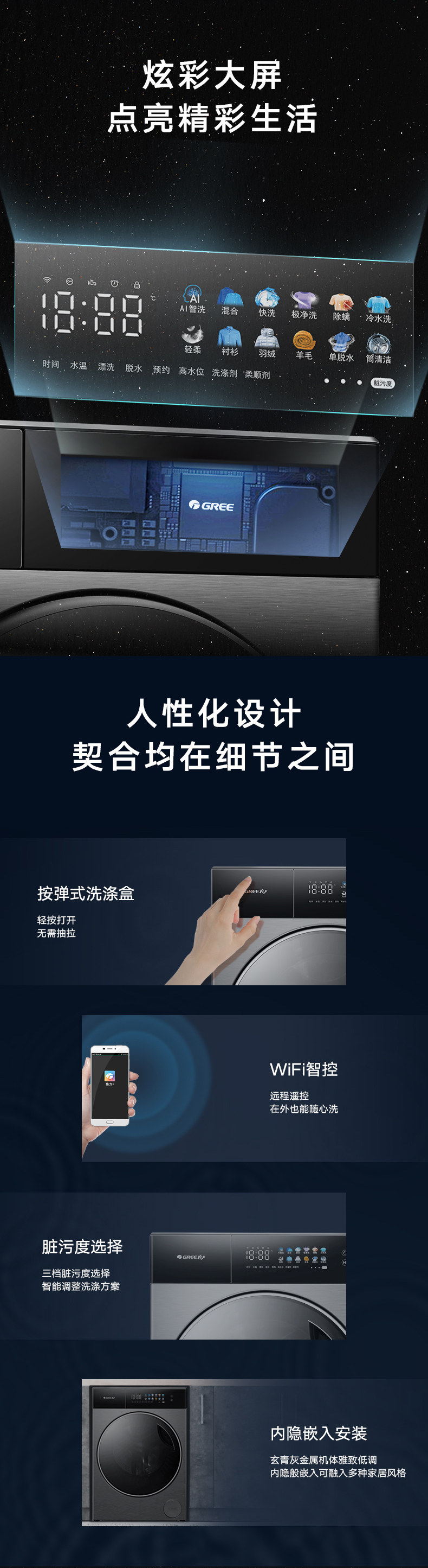AI智能感應,臟污一鍵洗凈。AI慧眼識污,智能判斷洗滌凈度,洗凈比高達1.1