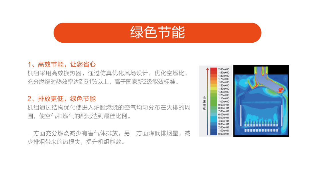 充分燃燒效率達到90%以上,采用智能水溫調節,快速出熱水,減少水流浪費,恒溫±0.5℃以內精確控制,生活水溫度35-60℃,采暖水溫30-80℃。